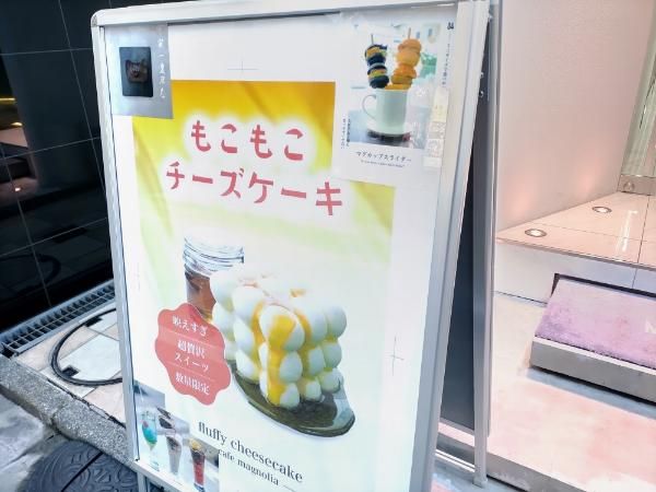 入口前にある「もこもこチーズケーキ」の看板が目印です。