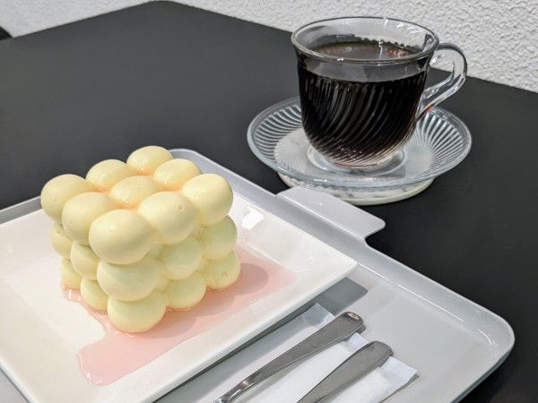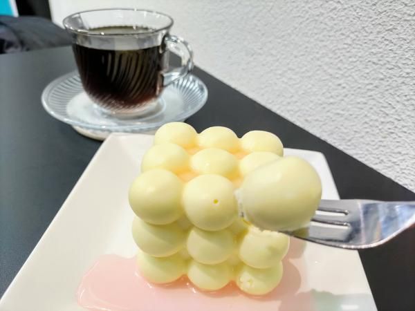 一口試しにいただくと、味わいは割とさっぱりとしたレアチーズケーキ。なるほど、ソースをかけると味わいが変わり、2度楽しめるんですね。店内では、このケーキを食べている人が圧倒的に多く大人気でした。確かに写真映えしますね。