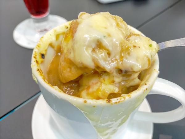 ほどなくして、お待ちかねの「オニオングラタンスープ」がやってきました。トロ~ッと、どこまでも伸びるチーズに思わずテンションがあがります。