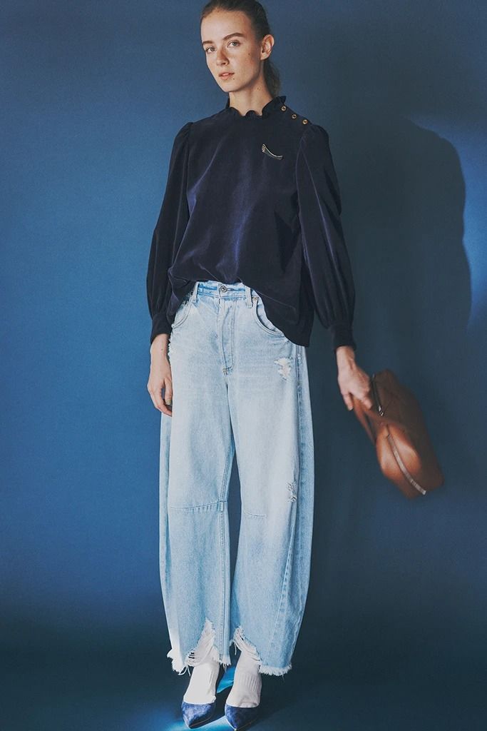 ネイビーベロアトップス 37,400円/TOMORROWLAND collection(TOMORROWLAND) ブルーデニムパンツ 51,700円/シチズンズ・オブ・ヒューマニティ(アルアバイル) ブローチ 4,400円/セピエ(ガリャルダガランテ 青山店) ソックス 2,200円/HOiSUM バッグ 50,600円/VASIC(ヴァジックジャパン) パンプス 29,700円/TSURU By MARIKO OIKAWA 黒よりも女らしい品のよさに。