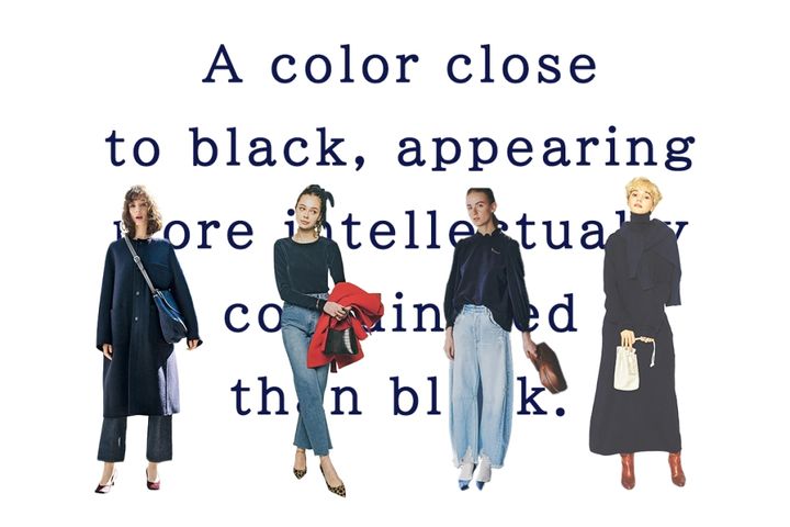 “とりあえず黒”の選びをを変えてみるだけで、ワードローブが生まれ変わる可能性が。代替する色は、例えばネイビー。色が持つ知的な印象、カジュアルなアイテムも高貴なムードをただよわせてくれる補正力。陥りがちなマンネリを解消でき、服をまとうことがまた楽しくなるための選び方とレパートリーを考察。