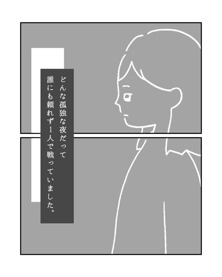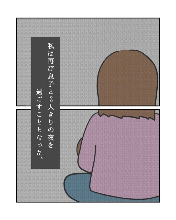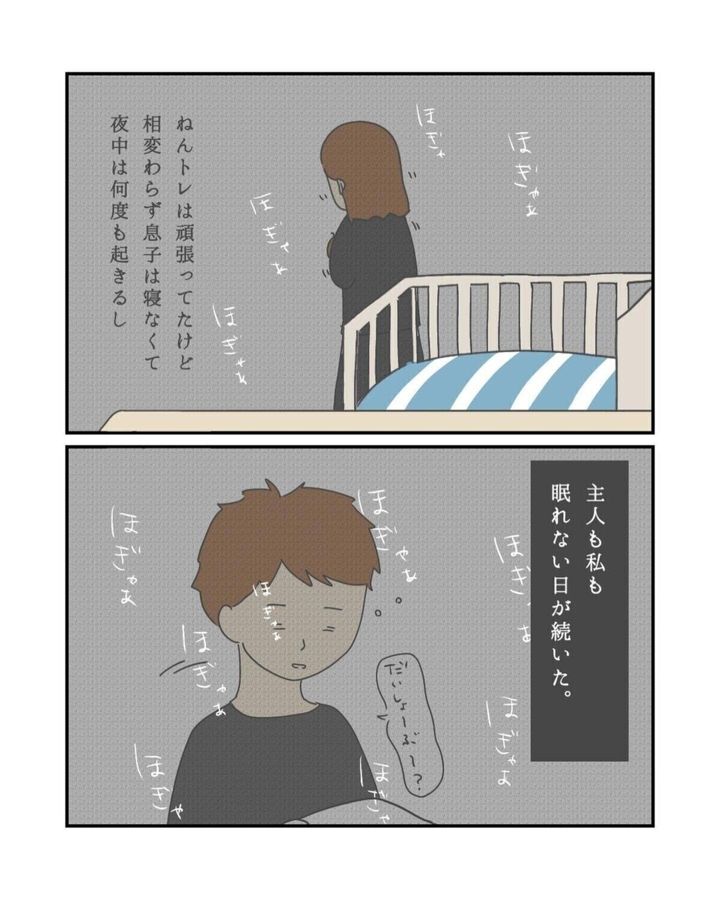 ぽぽ。(@popo_baby0104)さんは産後の里帰りを終え、夫と息子の3人での生活をスタートさせます。そのタイミングで始めたねんトレはなかなか成果が出ず、2人とも寝不足の日々を過ごしていました。1か月ほどたったある日、夫が職場で倒れ病院で睡眠不足という診断を受けてしまいます。夫を寝かせてあげるため、ぽぽ。さんは1人で息子の夜泣きに対応することに…。ぽぽ。さんは夫を頼ることができなくなり、少しずつ孤独を感じ、追い詰められていきます。
