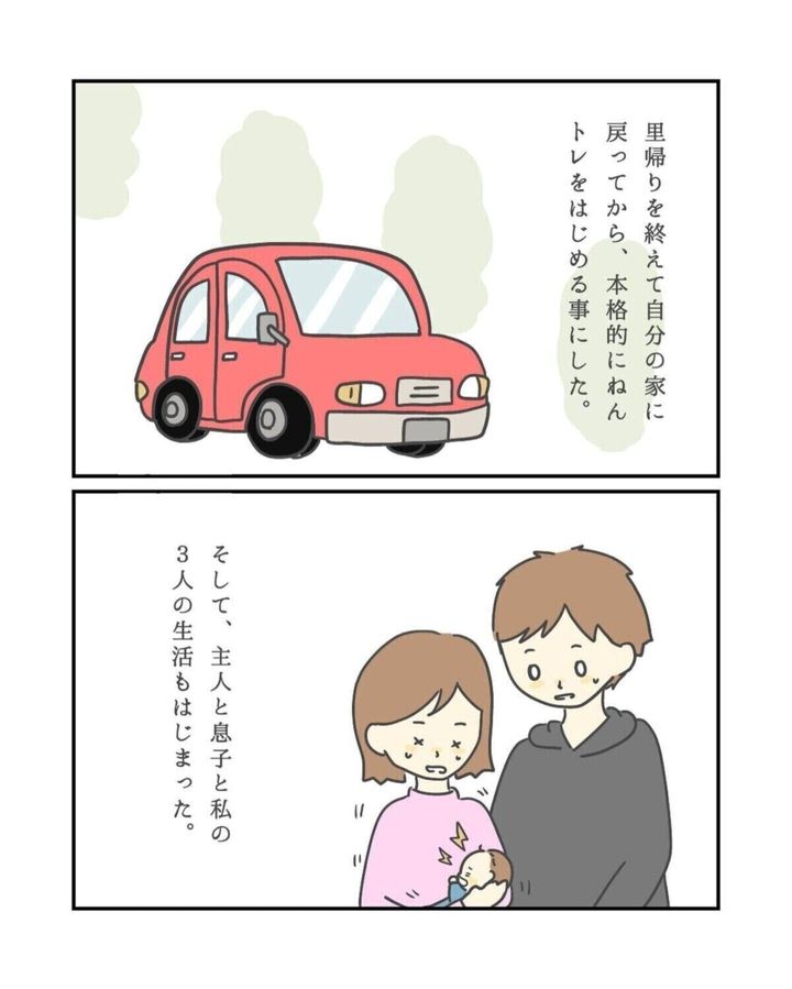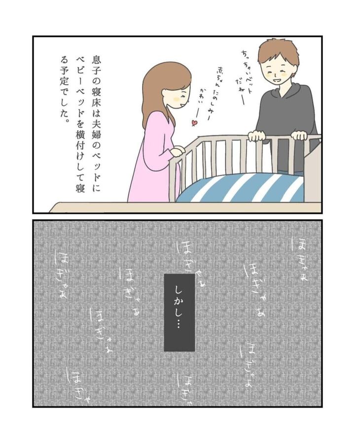 里帰りを終え自宅へと戻ったぽぽ。さんはそのタイミングでねんトレをスタートすることにします。息子はベビーベッドで寝てもらう予定でいましたが、寝るのが下手な息子はベビーベッドで寝られるはずもなく、夜中に何度も起きてしまい、ぽぽ。さんも夫も寝不足の日々を送っていました。
