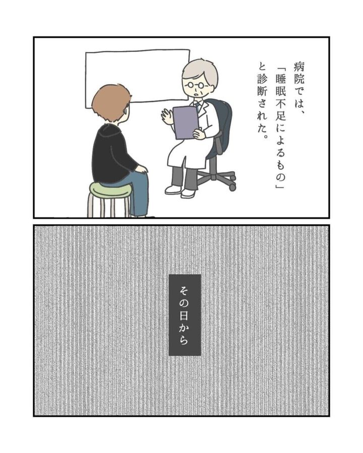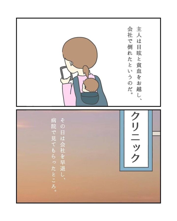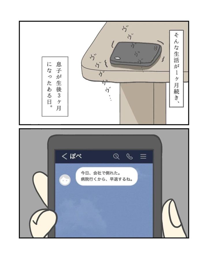 そんな生活が1か月ほど続いたころ、夫が会社で倒れ病院を受診します。睡眠不足が原因でめまいや貧血が起きてしまったことで、ぽぽさんは夫を頼ることができなくなってしまいました。夜泣きに対して夫が何かするわけではなくとも、声をかけてくれたり少し起きてくれたりするだけでも気持ちの面で楽になれると思いますが、ぽぽ。さんは夫にそういったことを期待することもできなくなってしまったようですね…。