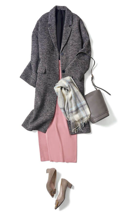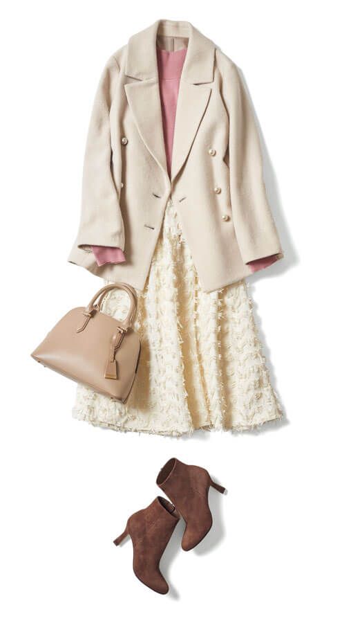 上品な甘さをちりばめてさりげなくデート仕様に。コートのパールボタンにニットのピンク色、スカートを彩る遊び心たっぷりのフリンジに、 彼と会う日のときめきを忍ばせて。小物はカッチリと、ONにふさわしいきちんと感も。