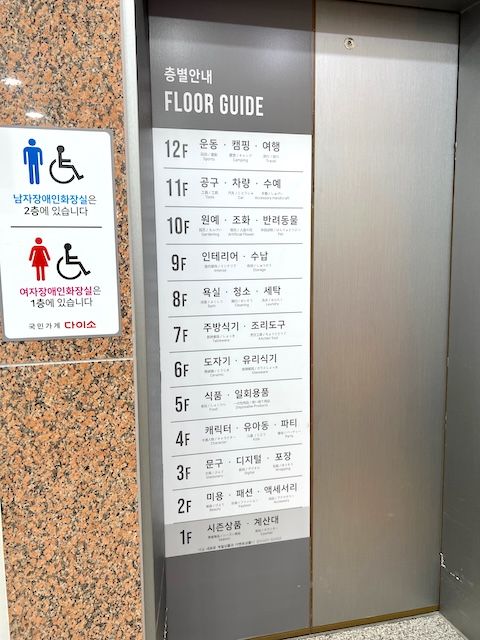 このビルは1階から12階まで全てがダイソー! フロアガイドは日本語でも書かれていて迷うこともありません。今回目指すのは2階の美容・ファッション・アクセサリー売り場です。