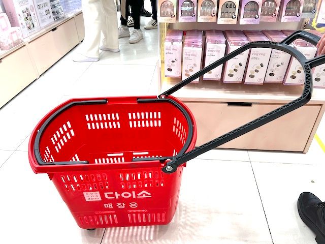 爆買いする人が多いためか、明洞駅店のダイソーのカゴにはキャスターがついていてカートのように押すことができました。これならたくさんお買い物をしても大丈夫! 通路があまり広くはないのでちょっと人にぶつかってしまうのが難点です。
