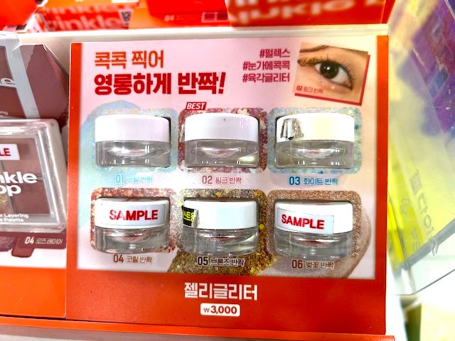 キラキラしたメイクが捗りそうなゼリーグリッター(3000ウォン)は売り切れなのかテスターしかありませんでした。