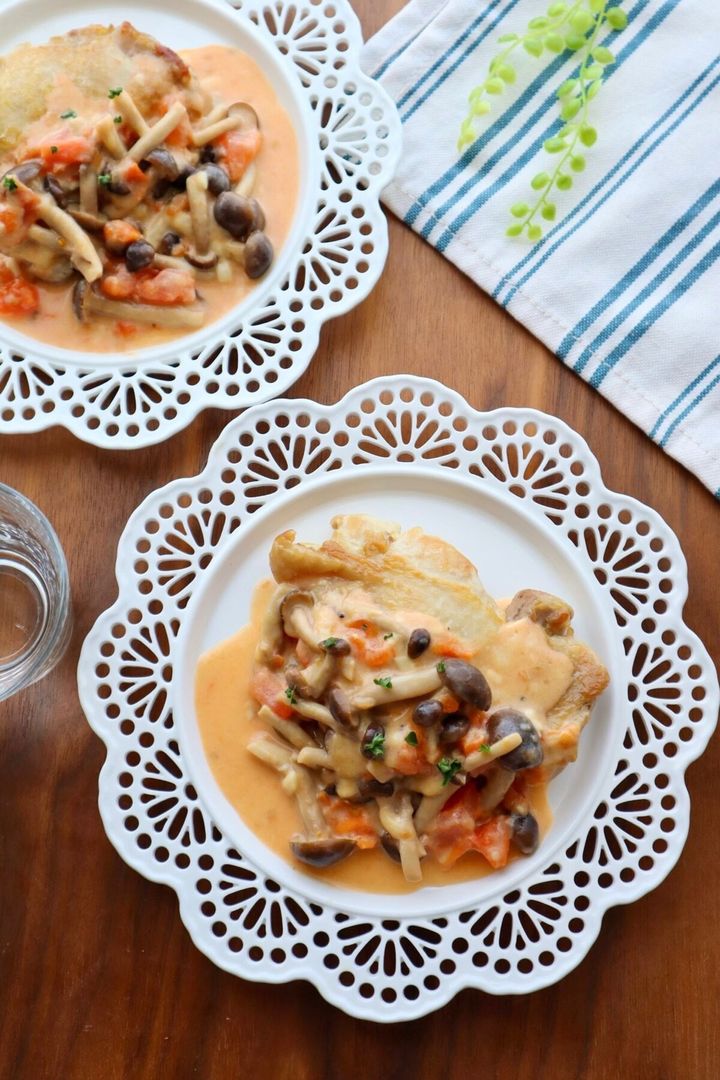 まるでカフェのような華やかな見た目のチキンステーキのトマトきのこクリーム添え。家にある調味料で簡単に作れて、見栄えもするのでパーティーにもおすすめです。