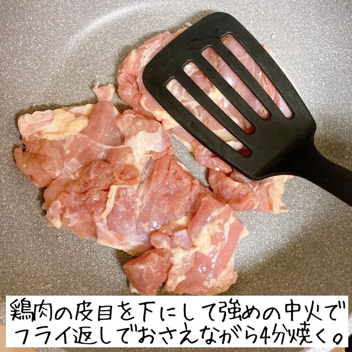 鶏肉の皮目を下にして強めの中火にかけ、フライ返しでおさえながら4分ほど焼く。