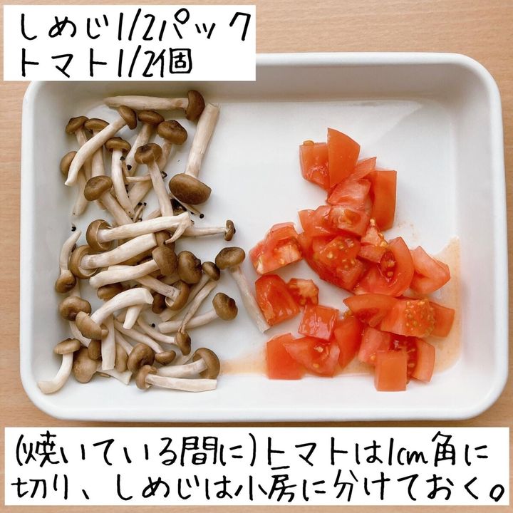 焼いている間にトマトは1㎝角に切り、しめじは小房に分けておく。