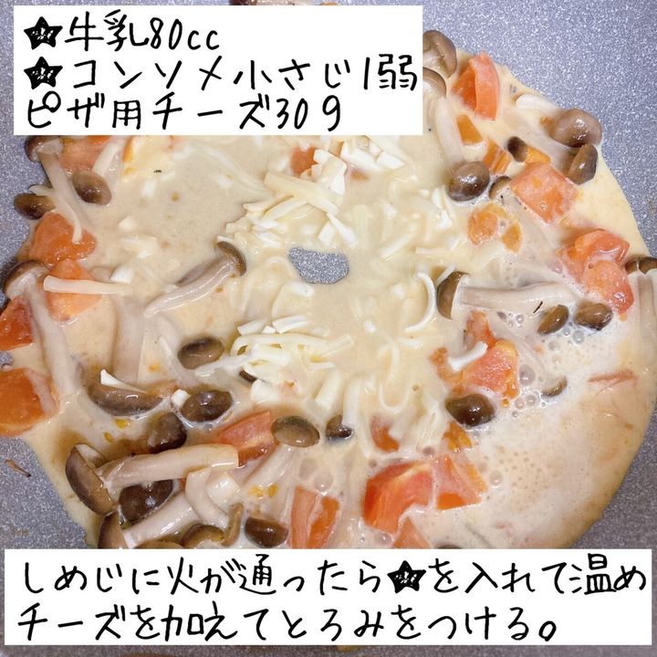 しめじに火が通ったら★を入れて温め、チーズを加えてとろみをつけ、鶏肉にかける。