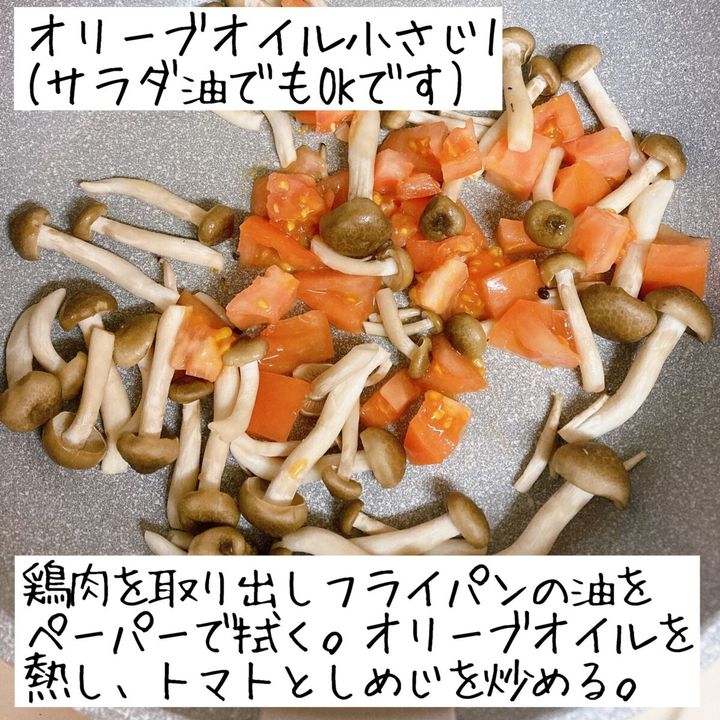 鶏肉を取り出し、フライパンをさっと拭く。同じフライパンにオリーブオイルを熱し、トマトとしめじを加えて炒める。