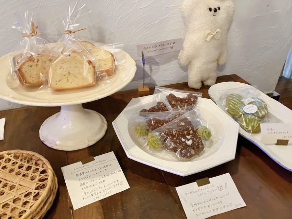 おしゃれな店内に、まるで飾り付けられた小物のように置かれた手作りのそば粉を使ったお菓子も販売しています。庭になっている無農薬レモンを使って作られたバウンドケーキや目がかわいいクッキーを私は家族へのお土産にしましたよ。