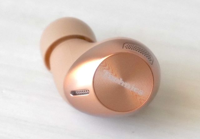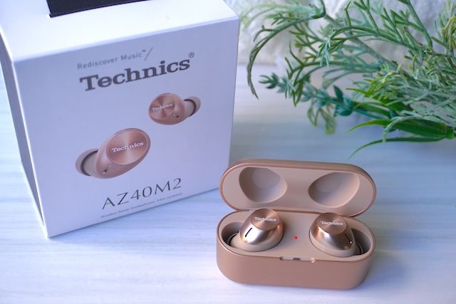 今回試してみたのはテクニクスの「EAH-AZ40M2」。筆者の中では何よりもこの可愛いカラーとデザインが一番のお気に入りポイントです。イヤホンなどのガジェットはゴツくなってしまいがちですが、丸みを帯びたケースはキラキラした小物の中にも溶け込むデザイン。特に今回チョイスしたローズゴールドはピンクがかったカラーが上品で大人可愛い雰囲気。