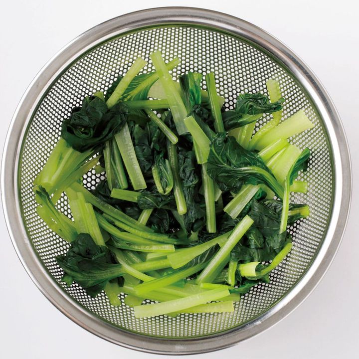小松菜は、水にとらずにざるに上げ、粗熱を取って水けをよく絞る。