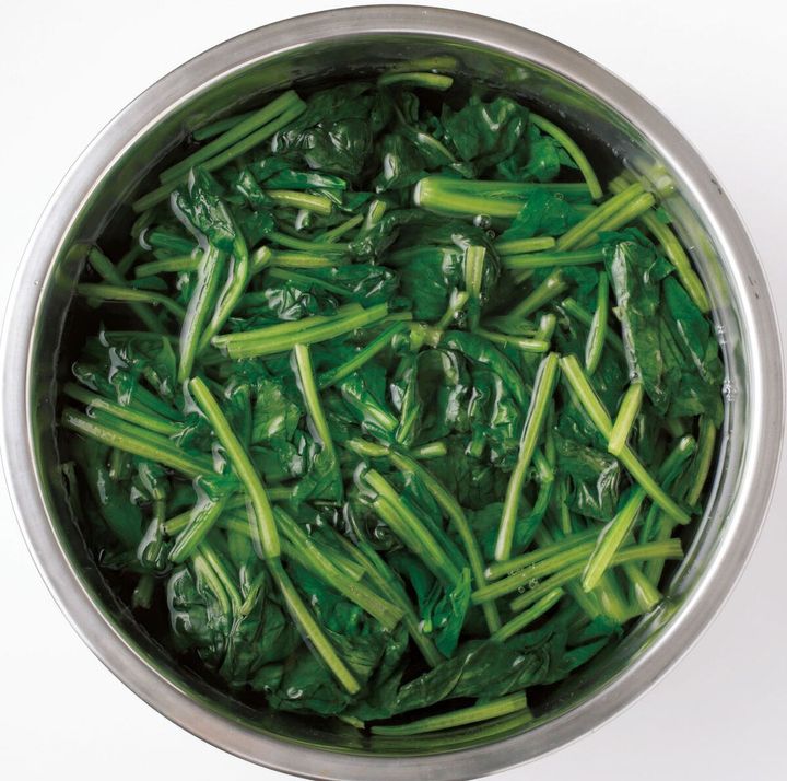 ほうれん草は、別のボールに水をはり、(2)を入れる。ボールの水を何度か替え、粗熱が取れたら取り出して水けをよく絞る。