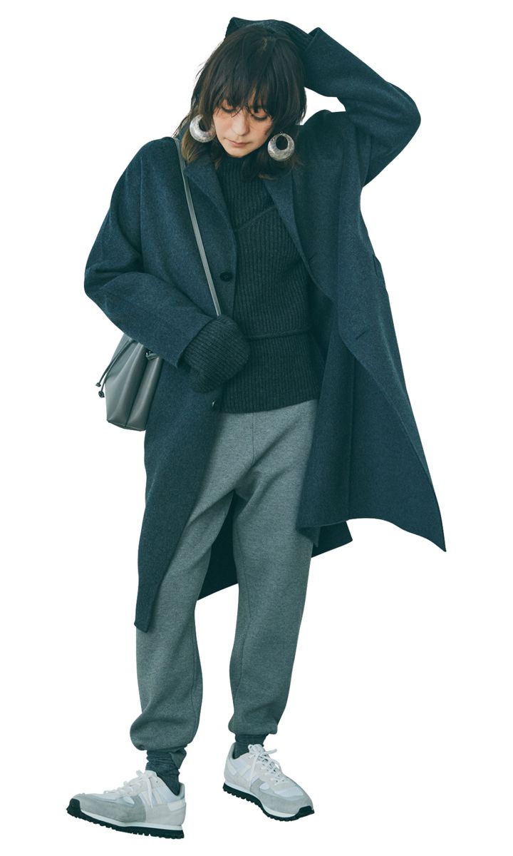 コート¥99,000(ギャルリー・ヴィー/ギャルリー・ヴィー 丸の内店)、ニット※ビスチェ付き¥39,600(ウーア/ジャーナル スタンダード レサージュ 銀座店)、ニットパンツ¥19,910(リネイヴ/ネイヴ)、ピアス¥24,200(アダワットトゥアレグ)、バッグ¥24,200(ヤーキ/ヤーキ オンラインストア)、ソックス¥1,540(タビオ)、スニーカー¥30,800(ゼットディーエー/スティーブン アラン シンジュク)
