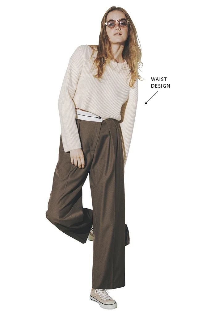 白ショートリブセーター 40,700円/グリードインターナショナル(グリードインターナショナル トウキョウストア) ワイドパンツ 27,500円/TODAYFUL(Life’s 代官山店) 茶サングラス 41,800円/アヤメ ベージュスニーカー 7,700円/コンバース(コンバースインフォメーションセンター)