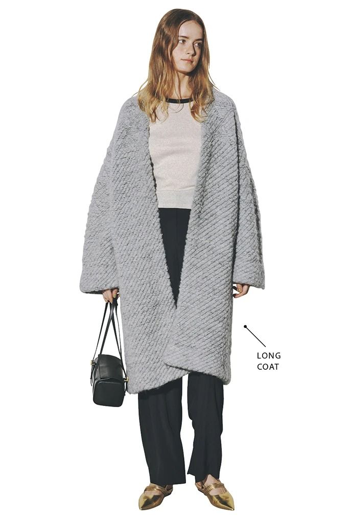 足元はフラットシューズ。さらに、パンツもアウターもすべてゆるやかなシルエットで着心地の良さをキープしながらも、きちんとスタイルアップがのぞめる補正力のあるガウンコート。お堅い印象より、気だるいオシャレなムードがただようのに、きちんと縦長な印象をもたらしてくれるのが優秀なポイント。中は極力ほっそりさせてボリュームを調整。