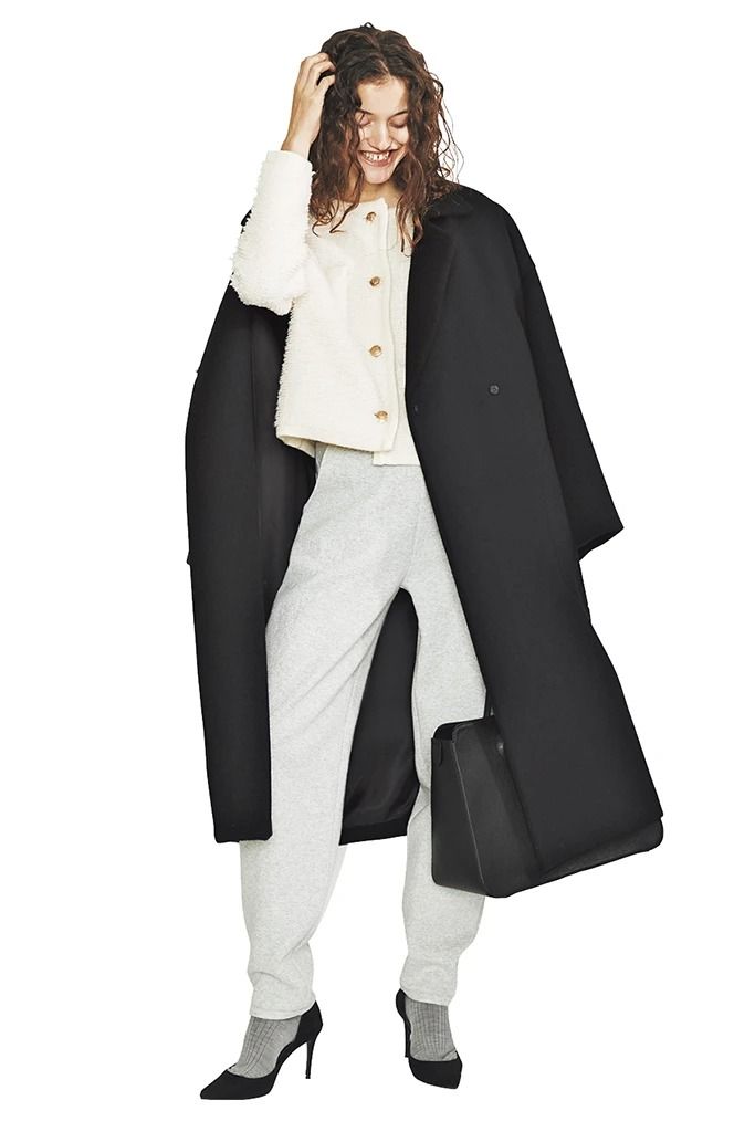 スエットパンツでメンズMIX。ループニットで女性らしいやわらかさを表現。金ボタンのおかげでほどよく背筋が伸びる。