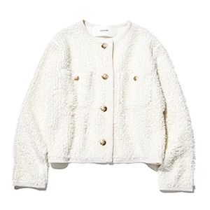 クラシカルな趣のツイード風のニットジャケットが、この時季に欠かせない新たな選択肢に。なぜなら、アウターとしてはもちろん、コートの中に仕込んでトップス風にふるまうことも可能だから。白のループニットの穏やかさと金ボタンの高貴な重みで、強さとやさしさを両立させて。