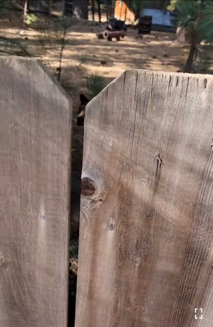 愛犬たちを映した後、男性は何かの気配を感じたのか裏庭を囲う柵の方に近づきます。 そして向こう側を覗くと・・・