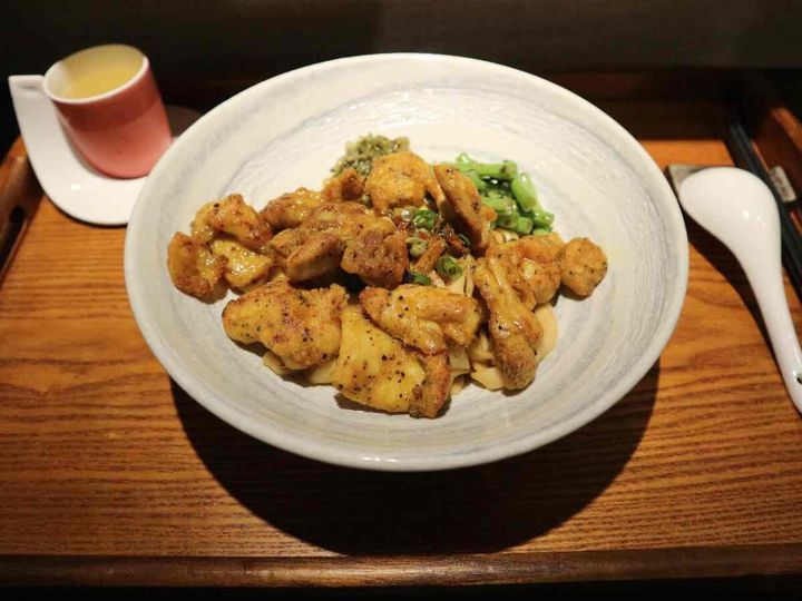 麺料理のお店「來了就吃(ライラジウチー)」は、うっかりしていると通りすぎてしまいそうな隠れ家のような小さなお店で、店内もカウンター席が10席ほどあるのみ。おすすめは、揚げた鶏肉がたっぷりのった汁なし麺「初來乍到雞腿麵」で、ジューシーな鶏肉ともちもち太麺が相性抜群で、食べ応えがあります。