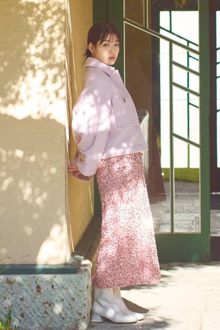 ピンクスパンコールスカート 14,300円/The Girls Society ピンクミドルジャケットコート 23,100円/SNIDEL イヤリング 1,870円/GOLDY ブーツ 32,890円/STACCATO(バロックジャパンリミテッド)