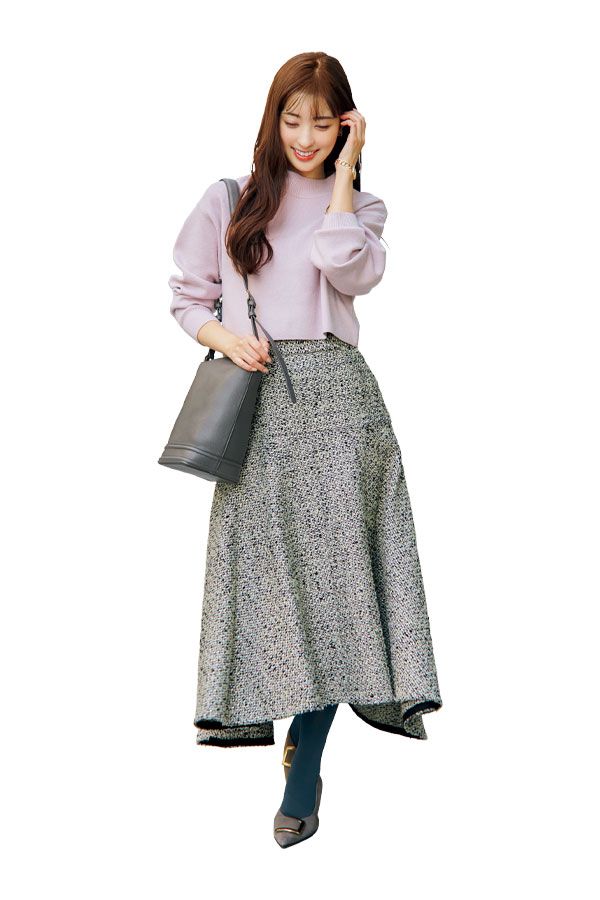 ニット¥14,300/ジャスグリッティー スカート¥69,300/アンタイトル 【温脚Labo】ふわふわ裏起毛ボディウォーマー¥1,760/タビオレッグラボ(Tabio) タイツ¥1,320/ 靴下屋(Tabio) イヤリング¥1,870/アネモネ(サンポークリエイト) 時計¥41,800/ココシュニック バッグ¥5,940/カシュカシュ(アンビリオン) パンプス¥24,200/銀座かねまつ(銀座かねまつ6丁目本店)