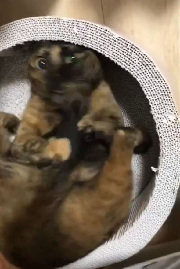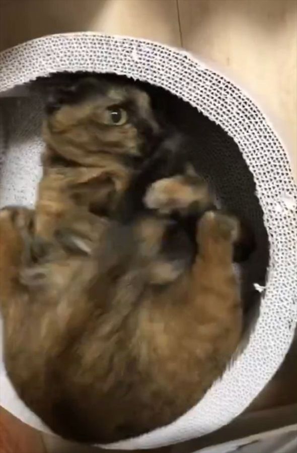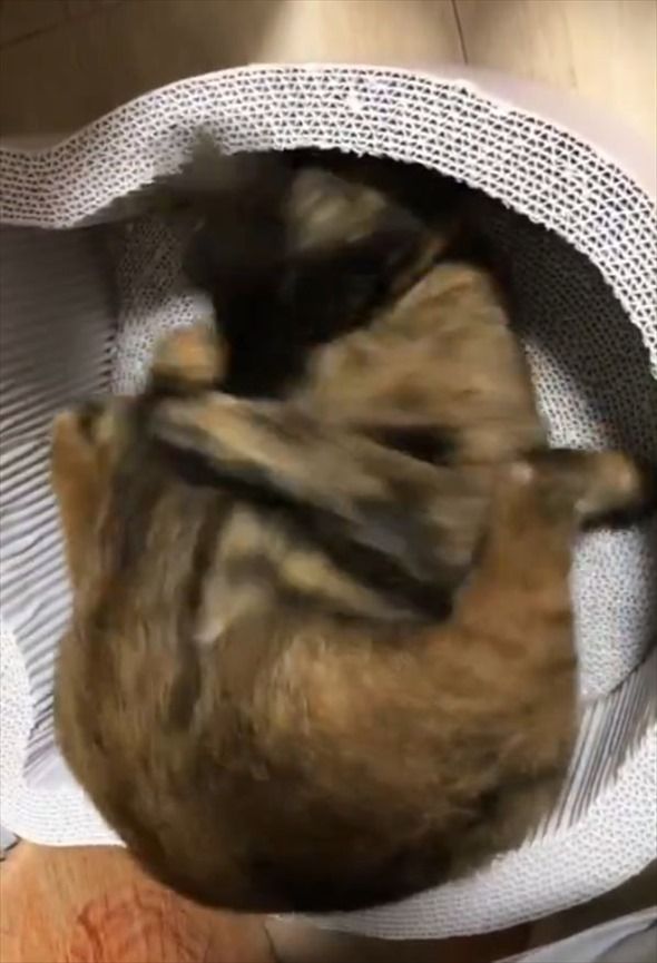 3. しっぽを抱えながらコロコロ。サビ猫がその場で動き回っているその姿が、とてもかわいい!!