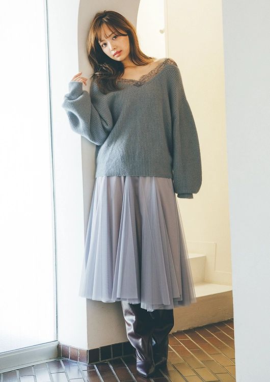 グレーオープンショルダーニット¥15,400/マイストラーダシ アーティアードスカート¥20,900/アルページュストーリー ニーハイブーツ¥26,400/CELFORD ルミネ新宿1店
