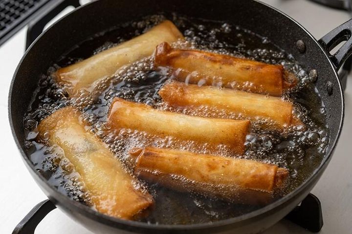 170~180℃に熱した揚げ油で、こんがり色づくまで揚げる。具材から水分が出ないように、巻いたらすぐに揚げるのがコツ。