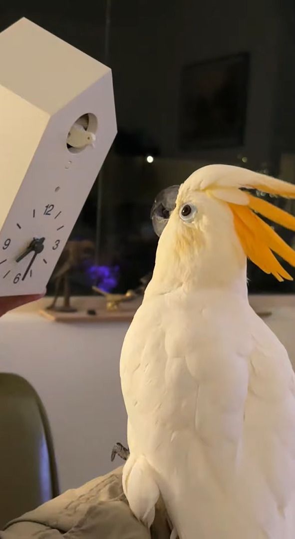 キバタンは新入りが気になる?鳩時計から姿を見せるカラクリを食い入るように見つめています!!【アメリカ・動画】
