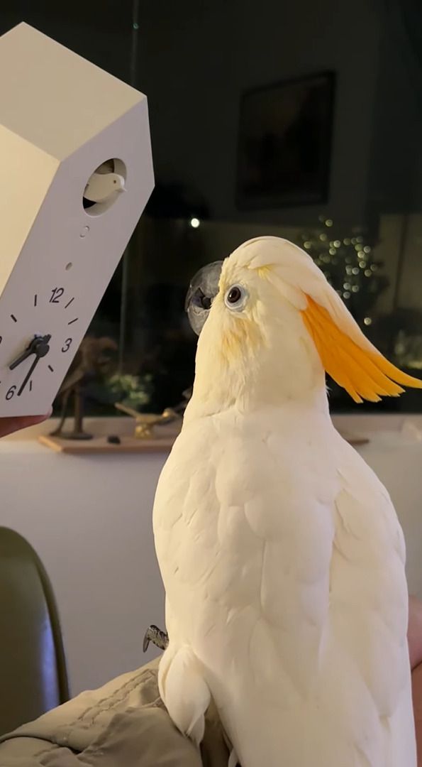 キバタンが食い入るように見つめている、鳩時計。 顔を出すカラクリの鳥のことを新しくやってきた仲間だと思っているのか、じーっと見つめています!!