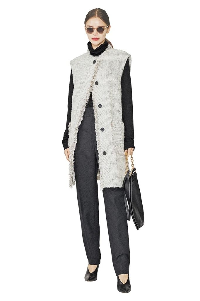 シャープな印象でいたいから、シルエットは体の線をキレイに見せるIラインにこだわりあり。タイトな形を味方につけつつ、縦落ち素材や長め丈も利用。もちろんこの上にコートをはおっても着ぶくれせずキレイなまま。ジレは一番上のボタンだけをとめて、重心を引き上げる。小物も黒にそろえてミニマルに。