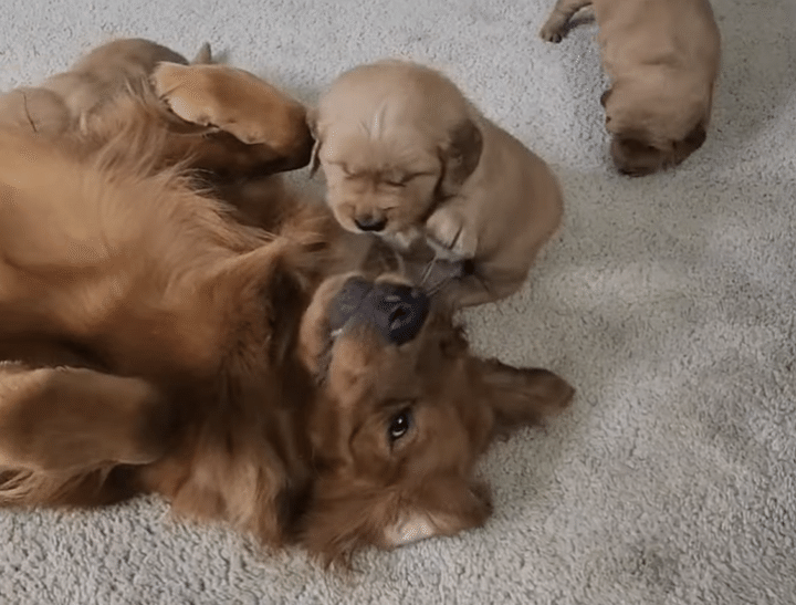 ママも子犬もどっちも可愛い♡ へそ天ポーズで遊ぶ犬親子。