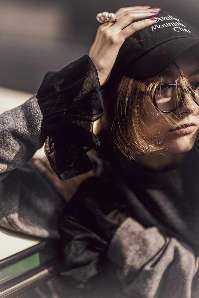 そで以外はカットソー素材だから1枚でも着やすい。大きなグレーの中に、そで、キャップ、足元と黒を際立たせて。メンズライクなムードとロマンティックなすそ、そしてスポーティなスニーカー。テイストMIXもポイント。