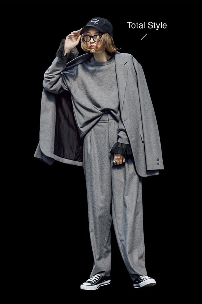 グレーウールジャケット 93,500円、グレーニット 91,300円、グレーテーパードパンツ 50,600円/以上ATON(ATON AOYAMA) 中に着た黒シアースリーブプルオーバー 15,400円/ザ ポーズ(ウィム ガゼット ルミネ新宿店) キャップ 7,480円/SEA(エスストア) 眼鏡 38,500円/アヤメ 〈右手〉シルバーパールリング 27,500円/LOVE BY e.m.、〈左手〉シルバーワイドリング 36, 300円/e.m.(ともにe.m. 青山店) スニーカー 6,380円/コンバース(コンバースインフォメーションセンター)