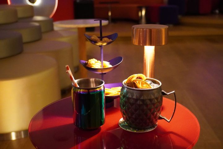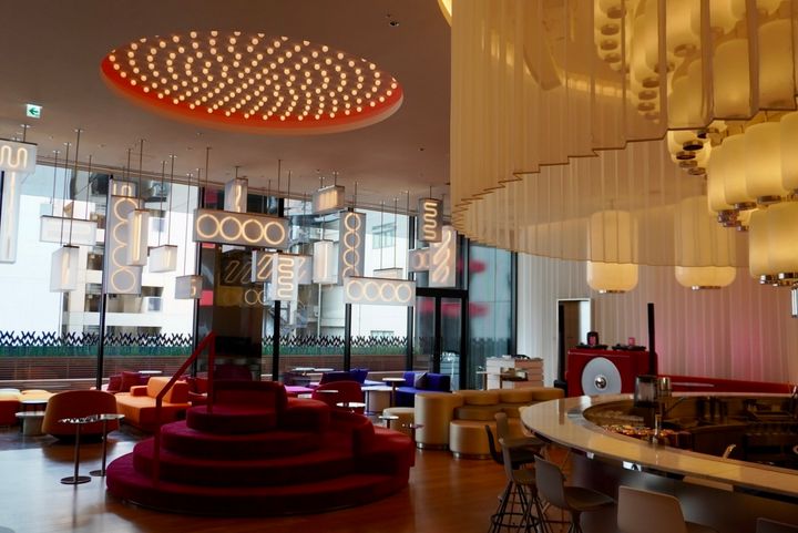 Wホテルといえば、キラキラした華やかな空間が特徴的。こちらも、コンセプトは「大阪商人の遊び心」ということで、大阪出身安藤忠雄氏がデザイン監修した真っ黒な外観とは対照的に、内側のインテリアはカラフルで、道頓堀からインスパイアされたネオンや、真っ赤な漫才ステージ、提灯を模した大きなランプシェードトランジスタラジオのようなDJブースなど遊び心溢れるさまざまな要素から、元気な大阪を感じることができます。