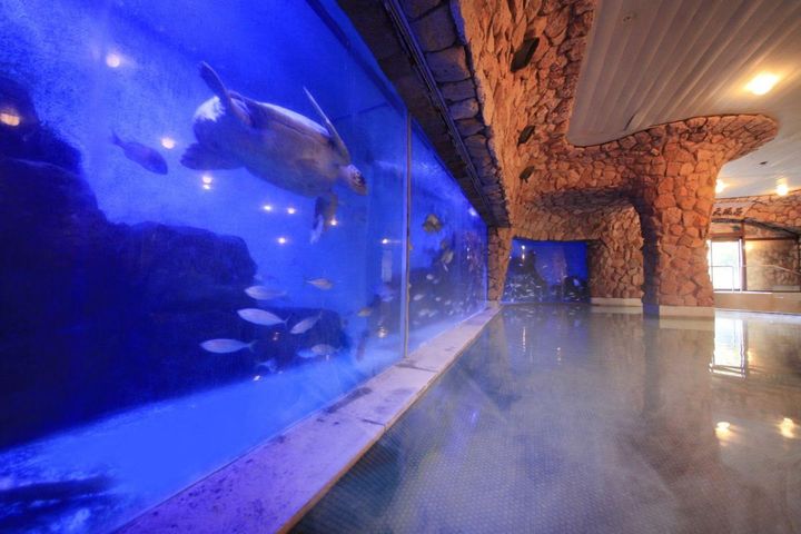 私が見つけたとっておきの過ごし方は、亀や魚が泳ぐ大きな水槽がある「海底温泉」を楽しんだ後、ナイトラウンジ〈エメラルド〉クリームソーダをいただくということ。なんだこの、最高の風呂上がりタイム!大人って、最高だ〜!幼少期に訪れた時とは、一味違う楽しみ方ができて、大満足でした。
