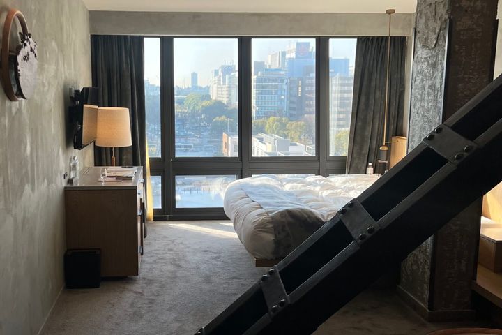 ここに泊まれるなんて、びっくり!ですよね。お部屋にも躯体の鉄骨が、かっこよく突き抜けていたり、窓枠や眺望含め、常にテレビ塔に泊まっているワクワク感を味わうことができます。外に出て、地上から自分の部屋を見ると、「あそこに泊まっているのかー!」と感動もひとしお。