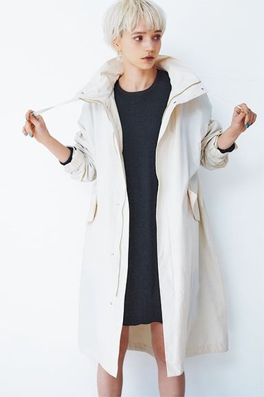 ロングコートで隠せばミニ丈もたやすい。アウトドアのムードを感じさせるロングコートで、ミニワンピにありがちな幼さを払拭。シックなモノトーンでまとめたのも大人っぽさへのカギに。足元はブーツで強めに、あるいはスニーカーなどカジュアルにくずして。