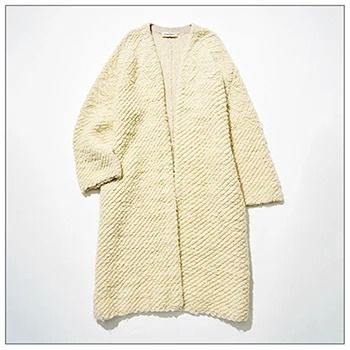アイボリーコート(レザーベルトつき) 130,900円/SAYAKA DAVIS(ショールーム セッション) ほどよい厚み・ゆるすぎない形・長めの丈でもたるまないしっかりとした生地感。これらの条件ではなかなか出会えない、ニット素材のコート。カーデやガウンより防寒性が高く、1枚あると便利です。(スタイリスト・樋口かほりさん)