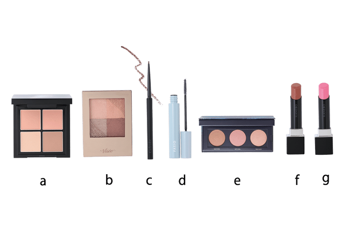 ベースカラーとしてきれいなピンクのgを唇全体に塗る。その上からダイレクトにくすみブラウンのfを重ねて、ピンクの甘さを自然におさえた控えめな血色感に仕上げる。