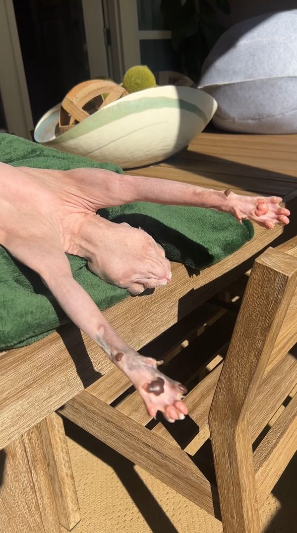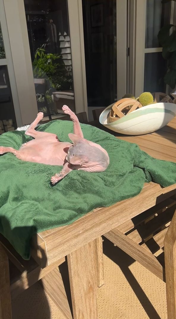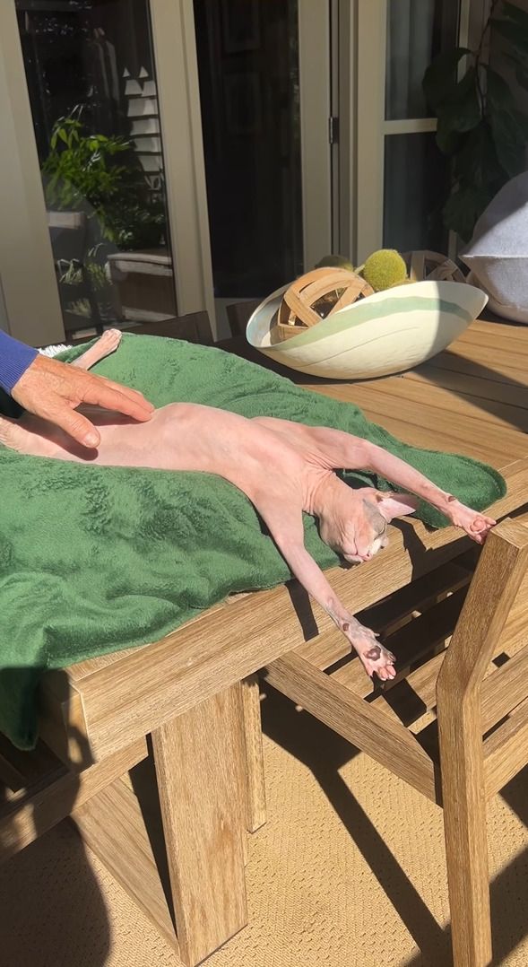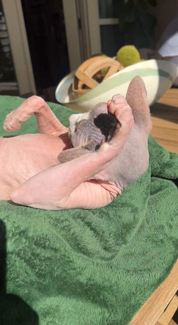 3. 日向ぼっこ中のスフィンクス猫。ヘソ天しているところにちょっかいをかけたら・・【アメリカ・動画】