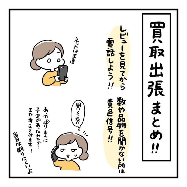 年末に家の片づけをしたミワカモさんは、大量に出た不用品の山を処分することになりました。状態の良いものは売ろうと考え、出張買取業者に依頼することに。しかし、やってきた業者は不審な点が多く、ミワカモさんは少し不安に感じていました。