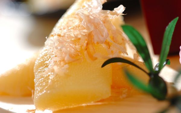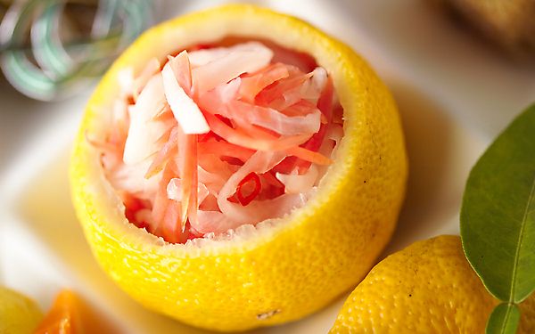 ユズをくり抜いて、搾りたてのユズ汁を足すのが美味しさの秘訣です。重箱に詰めれば、一際華やかな一品に。赤唐辛子をピリッと効かせることで、いつもとは違った紅白なますを堪能できるのも魅力です。さっぱりしていて食べやすいですよ。