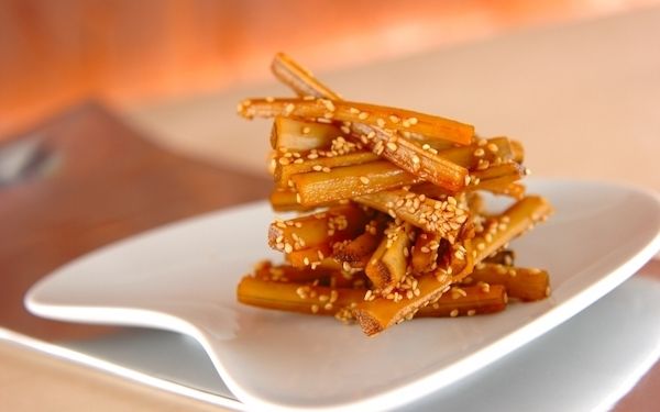 たたかない「たたきゴボウ」です。包丁でサクサク切って手軽に作れます。鍋に水を入れて沸かし、酢とゴボウを入れて8分ほど茹でてから、水気を切り、熱いうちによく混ぜ合わせたタレを入れて混ぜればOKです。パパッと作れるのが助かりますね。