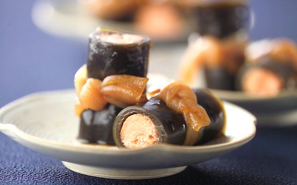 ピンク色がおせち料理の重箱の中でも映えるサーモンの昆布巻き。こちらでは甘塩鮭を使います。甘塩鮭は塩を少々入れた水に20分くらい漬けます。そして、塩分を抜き、水気を拭き取り、長さを半分に切り、骨と皮を取りましょう。鮭と昆布の旨みが混ざり合い、たまらない美味しさです。